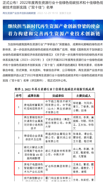 2022年12月29日,再生資源產(chǎn)業(yè)技術創(chuàng)新戰(zhàn)略聯(lián)盟正式公布了2022年度再生資源行業(yè)十佳綠色低碳技術和十佳綠色低碳技術創(chuàng)新實踐(“雙十佳”)名單。經(jīng)評選認定、公示等程序,中研院牽頭完成的“廢電路板富氧頂吹熔池熔煉技術”、參與完成的“廢電子電器綠色智能循環(huán)關鍵技術與產(chǎn)業(yè)化應用”共兩項技術榮獲2022年度再生資源行業(yè)十佳綠色低碳技術創(chuàng)新實踐成果獎。