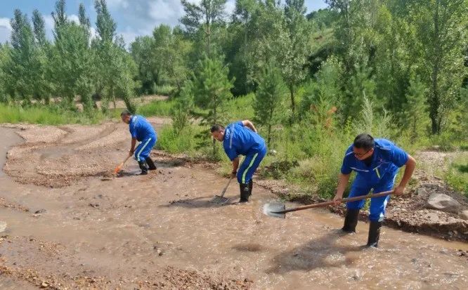 風(fēng)電公司洗馬林10萬千瓦風(fēng)電場運(yùn)維人員對存在積水積沙積石的溝道進(jìn)行清理
