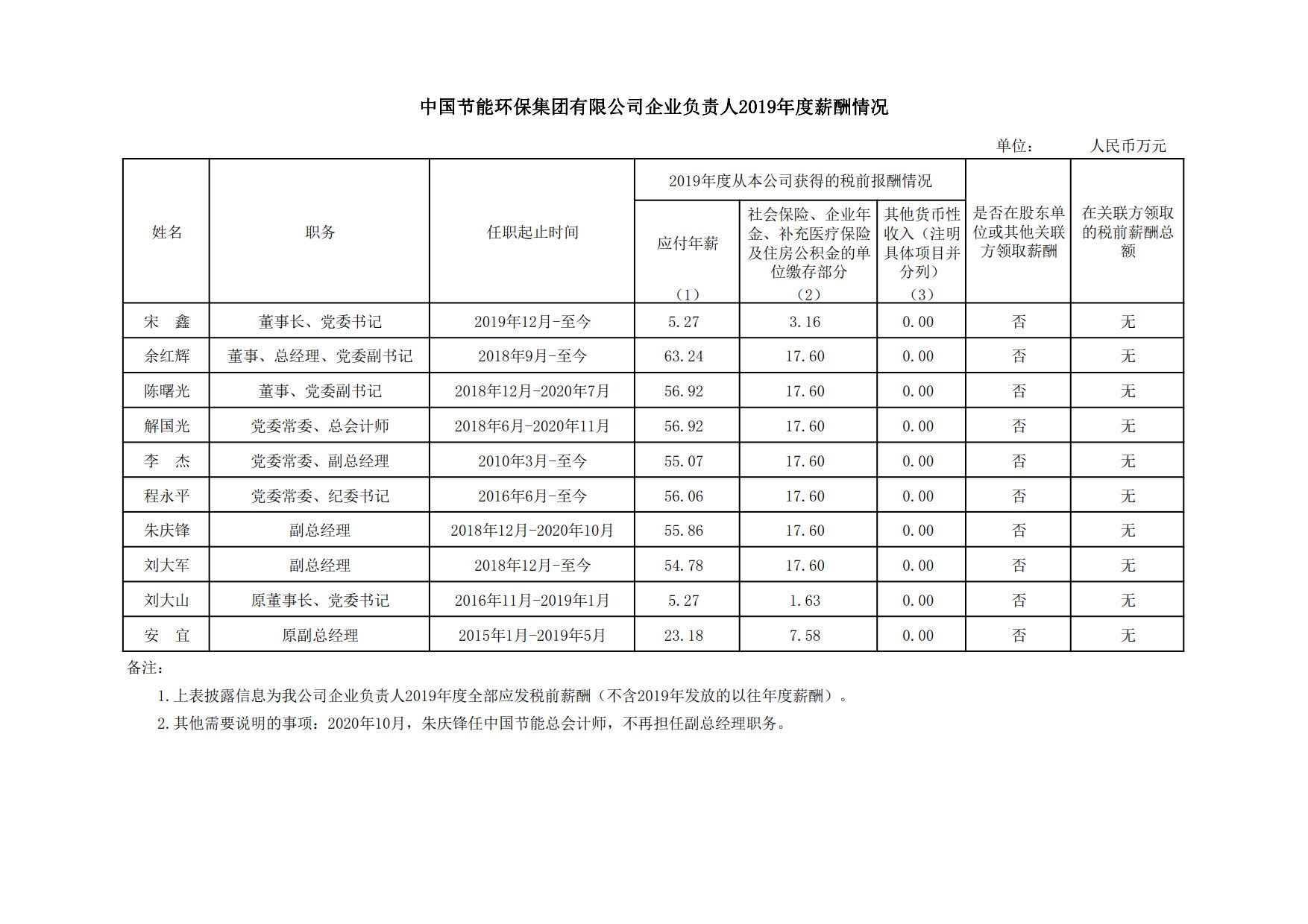 中國(guó)節(jié)能環(huán)保集團(tuán)公司企業(yè)負(fù)責(zé)人2019年度薪酬情況