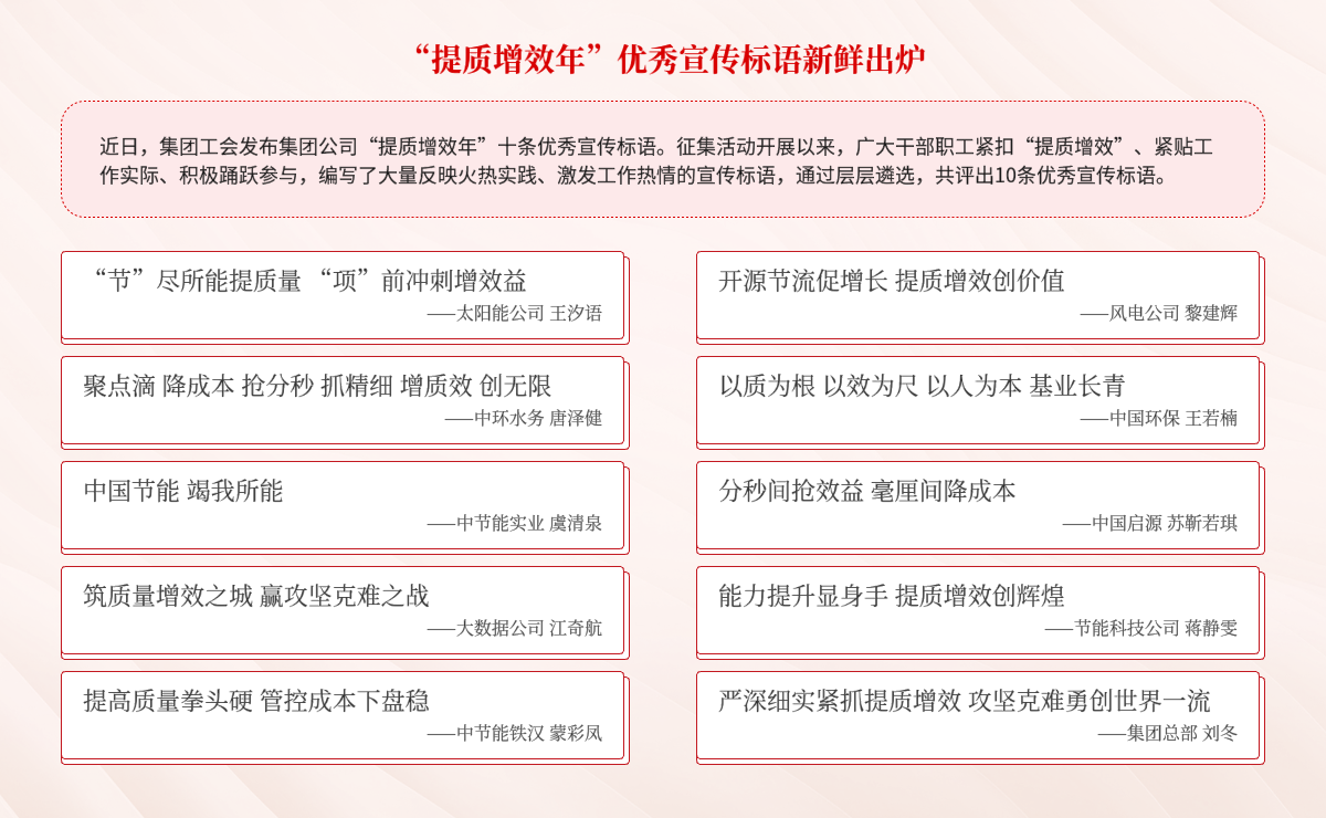 2024年是中華人民共和國成立75周年,是實現“十四五”規劃目標任務的關鍵一年。中國節能黨委決定把這一年確定為集團“提質增效年”,圍繞增強核心功能、提高核心競爭力,以提升“五個方面價值”為導向,對各級企業積極服務國家戰略,聚焦主責主業,強化市場拓展,狠抓科技創新,深化降本增效,推進精細化管理,做好風險防控,打造新質生產力、塑造發展新優勢進行全面部署,全力推動集團公司經濟運行實現質的有效提升和量的合理增長。中國節能官網現推出“提質增效年”專題,集中展示實踐活動中的好典型、好經驗、好做法,扎實推動“提質增效年”各項工作落實見效。
