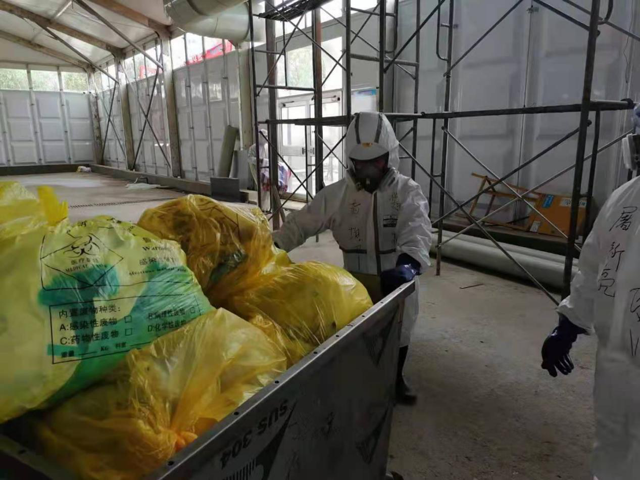 為“疫情”善后,嚴守疫情防控期間的最后一道關口。受生產設備影響,在處置醫廢垃圾時,由于醫廢量大且里面夾雜著衣物、棉被,破碎機和螺旋輸送機常常出現卡堵,嚴重時清理堵塞作業需要人鉆進輸送機內從下往上清理,由于空間狹小,只能伸進半個身子,工具派不上用場,加之疫情防控期間大家對病毒的畏懼和本身工作強度大,體力消耗大,沒人愿意進入窄小的空間里清堵。為了避免多人出現意外,保障設備的正常生產,黃均平同志率先進入作業點。因為無法使用手電筒,只能一點點摸索著用手摳和拉拽,從下往上的清堵工作進展緩慢。隨著清理物一點點拽出,破碎機滲出的排泄物、化學試劑、血漿等混合液體不斷滴落在頭頂,在狹小的空間充斥著惡臭氣體,雖戴著防護面罩也阻隔不了惡臭氣體的侵蝕,每隔幾分鐘作業就要探出身透透氣,再接著清理。戴著防穿刺手套也常常被扎傷和被刀片割傷,每扎傷、割傷后用酒精擦拭又接著干。加之破碎后的蒸汽在狹小的空間充斥,清理作業快則三個小時,慢則五個半小時,長時間的作業使體力消耗較大。清理完成后,往往是滿臉通紅、汗如雨下,要休息半個小時左右才能有所恢復。這時還要清理掉附在身上的黏液、血漿、排泄污物、及殘渣等,再讓作業人員幫助做消殺工作,脫卸被污染的防護服,再處理被割傷和扎傷的傷口,又穿戴上新防護和面罩開始工作。在黃均平同志的帶領下兩個班組人員逐漸克服了對清堵作業的畏懼心理,一旦發生堵塞都輪流著清理。